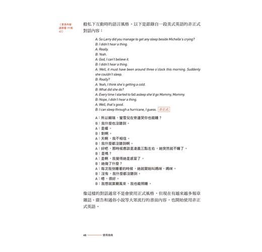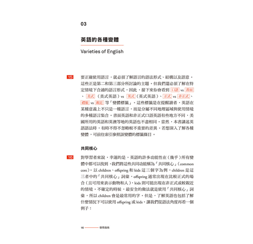 英語有各種變體,如美式/英式,正式/非正式,書面/口語英語等,跟書面英語比起來,口語對話顯得隨興沒有系統,但實際上,口語英語也有自己的語法特點。many與 a lot意思相同,但前者較正式,而a lot常見於非正式英語;縮寫形式是較不正式的英文;分詞構句是正式英語的常見句型;省略關係代名詞who其實較常見於不正式用法。本書是第一本系統化探討這些英語變體之間差異的書,幫助你根據不同情境場合,說出精準合宜的英語。
