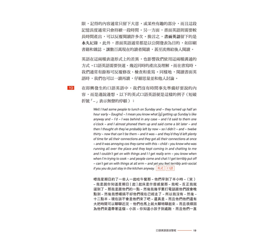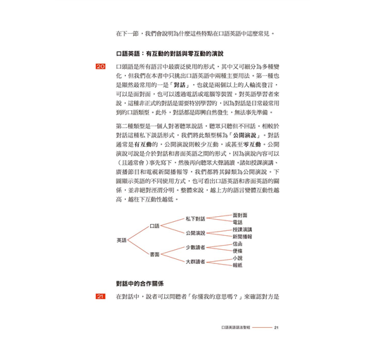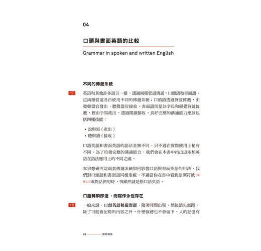 溝通式教學法的要素之一,就是讓學習者能使用並理解口語英語。這種對口語能力的強調有時會受到曲解,以致於一講到溝通式教學法,就只強調口語能力。我們並不認同這種觀點,「溝通」應該兼指口語和書面語的溝通。不過傳統文法書多半著重於書面英語,在本書中,我們秉持溝通式英語語法應兼顧口和書面英語。
