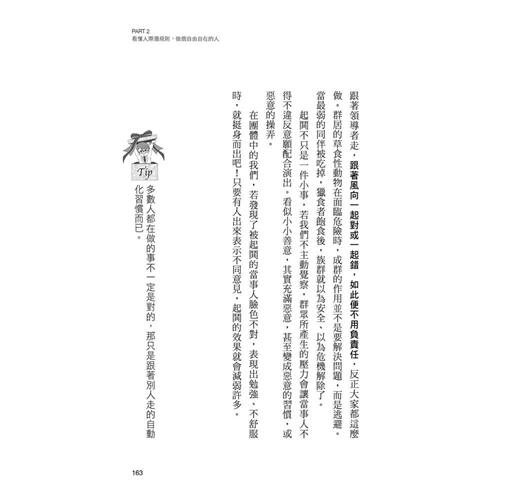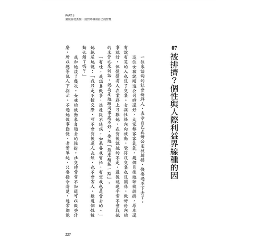 本書中,作者列舉多個人們易掉入的人際問題與陷阱,並提出該怎麼面對、如何全身而退,以及辨別是非不盲從的方法。譬如──