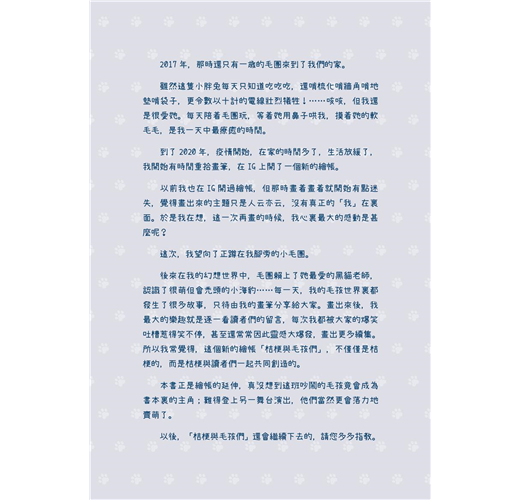 後來在我的幻想世界中,毛團賴上了她最愛的黑貓老師,認識了很萌但會禿頭的小海豹……每一天,我的毛孩世界裏都發生了很多故事,只待由我的畫筆分享給大家。畫出來後,我最大的樂趣就是逐一看讀者們的留言,每次我都被大家的爆笑吐槽惹得笑不停,甚至還常常因此靈感大爆發,畫出更多續集。所以我常覺得,這個新的繪帳「桔梗與毛孩們」,不僅僅是桔梗的,而是桔梗與讀者們一起共同創造的。