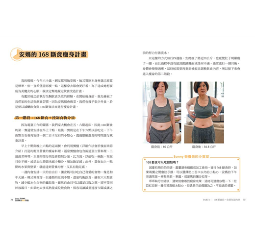 Sunny營養師的媽媽和很多媽媽一樣,忙工作、忙小孩,身材日漸失守。曾經試過生酮飲食,但無法抗拒食物的誘惑,反而變成高油高醣飲食,導致瘦身失敗。在兒子的專業協助下,以「168斷食瘦身餐盤」學會控制熱量與分量,每天吃得精采,一個月就瘦下4公斤、體脂降3%,而且持續變瘦中。