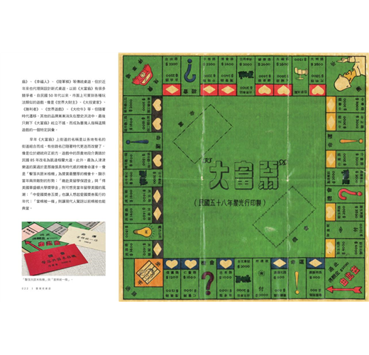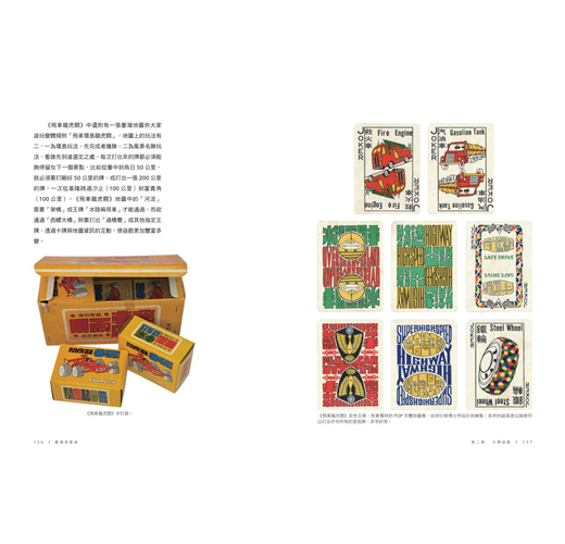 在這本書裡,我們可以見識到介宇收藏的廣度──光是大家耳熟能詳的《大富翁》遊戲,他便列出了六種外盒版本、十餘種類似玩法的遊戲盤。大富翁的房屋道具,居然能譜出臺灣工業的進化史。賽車主題的紙牌遊戲,也列出超過十種之多,根本已經一網打盡,只要是小時候玩過賽車紙牌遊戲的讀者,一定都能在琳瑯滿目的紙盒相片中,找到當年讓你廢寢忘食的那一副紙牌。