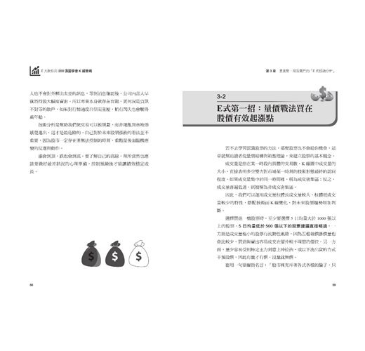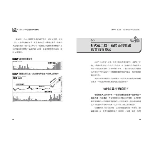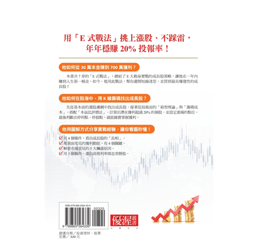 E大精通股票、期貨等交易操作,以100%親身實戰經驗,認為「波段成長股策略」最能穩定自己的長線績效,且最適合新手投資人,據此統籌歸納出一套「E式戰法」。完整且有系統的投資法,能帶領讀者在瞬息萬變的股市中走對路,找到最適合自己買賣股票的操作模式,用經過驗證且有效的投資方法,每年穩穩獲得20%投資報酬率。