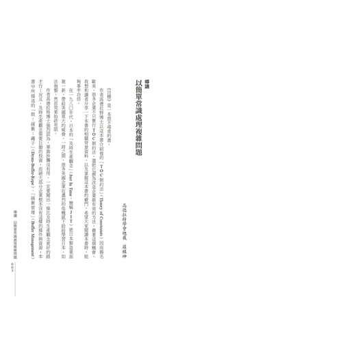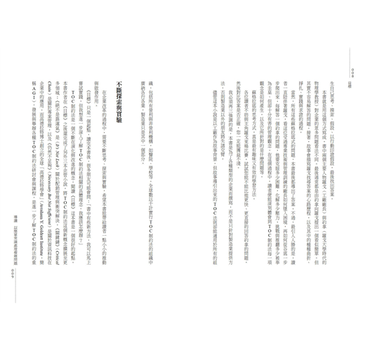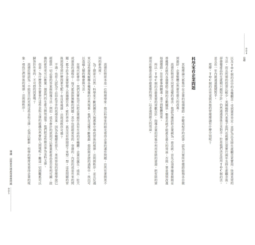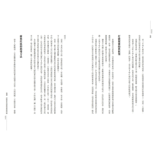 書中介紹的「TOC制約法」可以幫助讀者學會採用簡單明瞭的邏輯推演,找到問題的癥結,引導出改善的目標,解決複雜的管理問題。這套顛覆傳統企管理論的方法,受到全球高度重視,並且確實的在商業界、製造業、醫院、學校、家庭等各種組織有效運作。