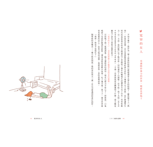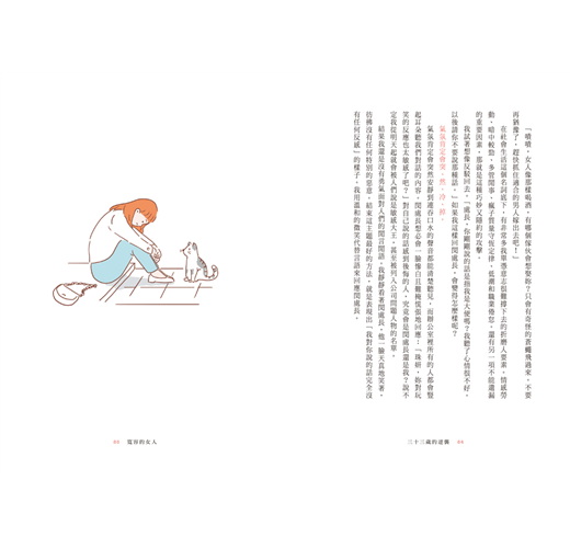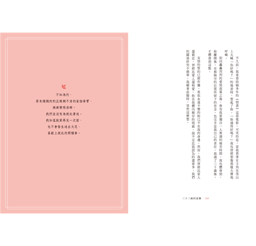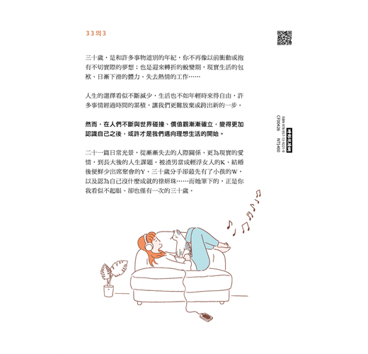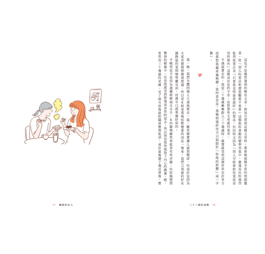 但我卻漸漸清楚自己想要什麼樣的人生。三十歲,是和許多事物道別的年紀,你不再像以前衝動或抱有不切實際的夢想;也是迎來轉折的蛻變期,現實生活的包袱、日漸下滑的體力、失去熱情的工作⋯⋯朋友之間的話題也從追星、美食和旅行變成健康檢查、適婚年齡和買房壓力。