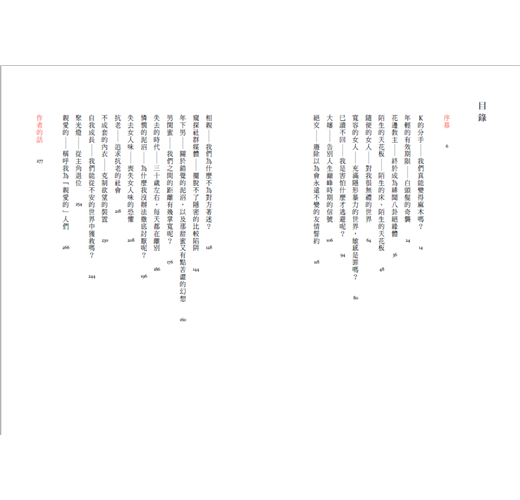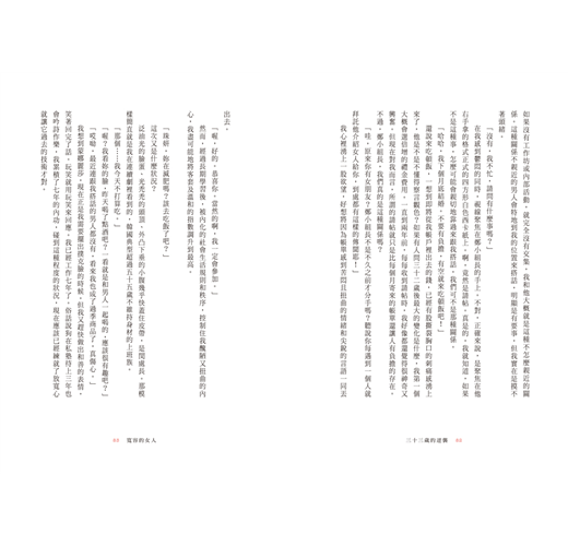 某個二十幾歲的人問我:「到了三十幾歲,妳覺得如何?」我回答他:「三十歲也沒什麼了不起的。」正如我所回覆的,我原本以為三十幾歲只是二十幾歲的延長賽,沒有什麼改變,但這是我天大的誤會。時間在無意識中流逝,除了我之外,許多事情也都在改變。充滿可能性和自信感的時期、那個信念很堅定的二十幾歲的世界,在不知不覺中,已悄悄變成三十幾歲的世界,它只替我留下不安、焦躁和不確定,其餘的許多東西,它都從我這裡奪走了。我所要背負的三十幾歲的重量,絕不是開玩笑的。白頭髮的登場和「巔峰時期」的退場只是其中的一小部分。