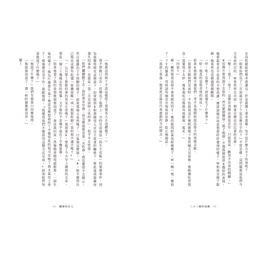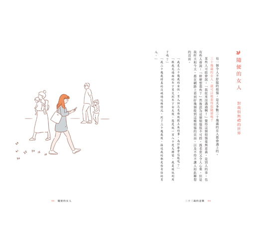 好陌生,結果都不是我在找的書,這些題目都沒有共鳴。為什麼這些書裡只有這麼現實的屬於大人的三十幾歲呢?也是,我之前也曾經茫然地認為,三十幾歲時就會煩惱理財技巧、升遷等經濟安定或社會成功的問題。我曾經想像,我的三十歲會是和之前完全不一樣的生活。我曾經以為,到時我一定會脫離二十幾歲的苦惱和徬徨,生活在理當安定且從容、確實又穩固的世界裡。