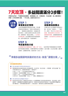 準備考試時重要的除了實力,還需要等待的毅力!無論是考前100天、30天、7天,只要其中一天開始怠惰,臨到考試時終將功虧一簣。以下是推薦給考生的考前7天密集訓練的準備時間表,並請搭配本書使用: