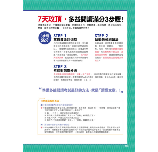 不要以為答對的題目就是真的會了,也許是猜對的。要徹底了解本書列舉的所有題型,因為這是怪物講師認真設計的必考題型。題目怎麼變,一樣可以輕鬆破解。