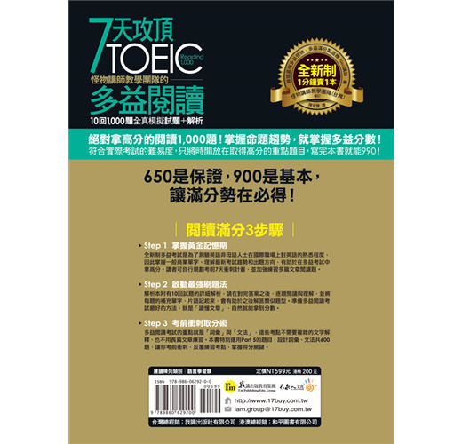 多益閱讀考試的重點就是「詞彙」與「文法」,這些考點不需要複雜的文字解釋、也不用長篇文章練習。本書特運用Part 5的題目,設計詞彙、文法共600題,讓你考前衝刺,反覆練習考點,能夠多拿一分是一分。