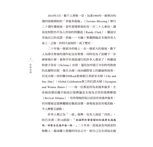為復興祈求的時候,可以做一些實際使我們自己和教會站上迎接復興位置的事。其中一個預備方式,就是研究其他復興。約翰與凱洛.亞諾特將他們在神裡面走過的這段旅程,以及有關多倫多祝福―1994年於他們教會開始的一場大能的復興―寫成這本精彩的書,細說他們從那時到現在的追求復興之路。他們也研究歷史上的復興、和滿有恩膏的屬神之人教他們的功課,全都寫在書裡跟我們分享。每一場復興都有神特別想要啟示給教會的關於祂的一面,所以務必尋找神在每一個偉大運動中凸顯什麼重點。要學習和領受祂想要啟示給我們的每一件事!