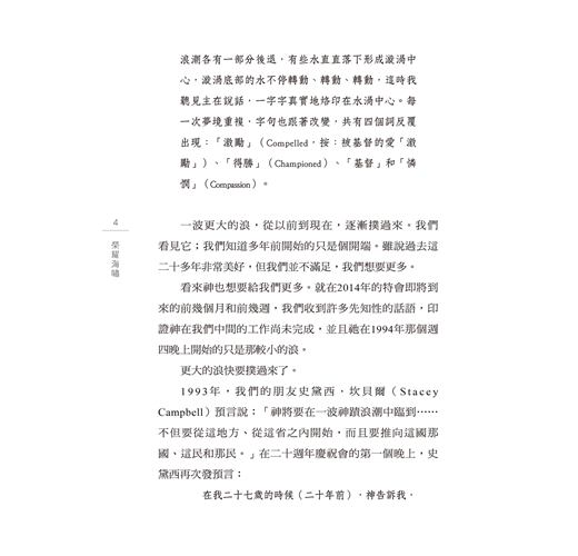 看見復興長什麼樣子、是什麼樣的感覺,進而能分享如何預備、如何回應的最佳人選,莫過於約翰與凱洛。即使在神裡面有那麼豐富的經歷,又接待了我們這世代影響最大的復興之一,他們仍然持續預備自己和他們的教會,迎接下一波更大的復興。約翰與凱洛是很有熱忱的人,他們不想停止、也不想安頓下來。他們很清楚永遠還有更多。能夠稱他們為我的密友,實在是我莫大的特權和榮幸。耶穌說我們會做比祂所做更大的事,雖說絕大多數人尚未看到或經歷到,但是我們想要,我們也知道祂所說的每一句話都是真實的。