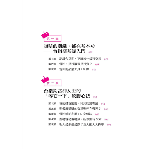 投資路上,她不斷嘗試、修正、調整,鑽研出一套高勝率的「女王當沖魔法」,除了可運用至多項投資商品以外,其強大的操作心法及獨特的解盤邏輯,亦相當值得投資人仿效、學習。