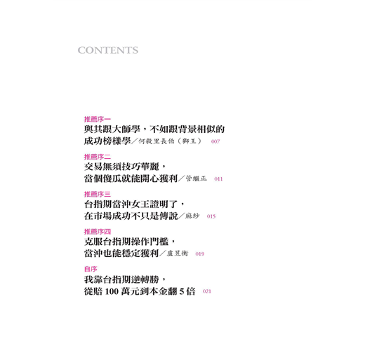 期許本書能夠成為你的基礎入門最佳參考書籍,更期望能帶給已有經驗的人轉變的契機,跟我一樣逆轉勝、常保獲利。