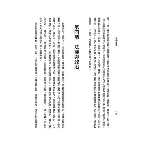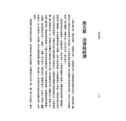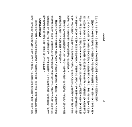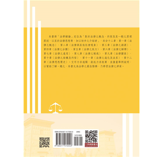 本書將「法學緒論」定位為「對於法律之概念、內容及其一般之原理原則,以至於法律思想等,加以初步之介紹者」,共分十二章:第一章〈法律之概念〉、第二章〈法律與其他社會現象〉、第三章〈法律之淵源〉、第四章〈法律之分類〉、第五章〈法律之效力〉、第六章〈法律之解釋〉、第七章〈法律之適用〉、第八章〈法律之制裁〉、第九章〈法律關係〉、第十章〈法律之結構及內容〉、第十一章〈法律之進化及法系〉、第十二章〈法律思想簡史〉。文字力求通順,敘述力求扼要,並儘量舉例說明,以幫助了解。總之,本書允為法學之最佳階梯,乃學習法律之津梁。