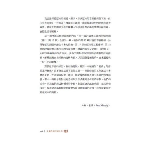 《金融市場技術分析》自1997年出版以來,已成為業內人士公認的技術分析「聖經」,並在全球譯為八種語言。這本傑出的金融著作,教導了無數交易者關於技術分析的哲理,以及在股市和期貨的臨場應用。美國市場技術分析師協會以本書作為「特許市場技術分析師」考試的內容基準;聯邦準備銀行在技術分析的議題上,也經常將本書列為主要參考資料。