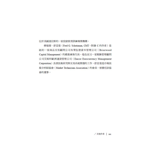 本書的架構源自於約翰.墨菲過去的暢銷著作《期貨市場技術分析》,在經過全面更新和修訂後,將內容涵蓋至所有的金融市場。除了技術分析的基本原理外,更收錄了各項重要的技術工具和參考指標,其中包括趨勢判讀、價格模式、時間循環以及市場互動關係等各大範疇。墨菲以簡潔、循序漸進的內容,教導投資人判讀市場圖表,學會如何在真實交易中發揮技術分析的關鍵作用。