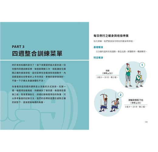 在第三部中,我會規劃出明確的訓練菜單讓你做起頭,為期四週的菜單涵蓋重訓所需的項目、組數、次數和相關技巧。也會教你根據自己的需求修改菜單的方法。即使是只有在健身房才能做的項目,也能修改成居家訓練。