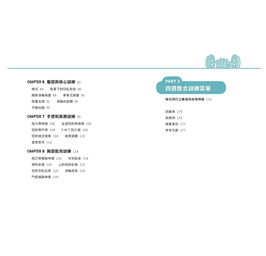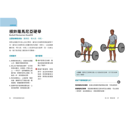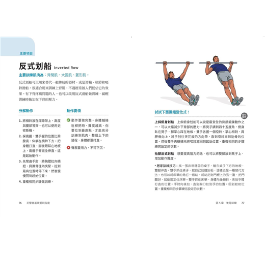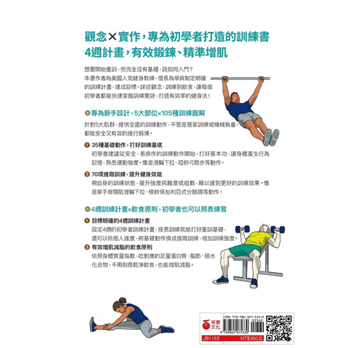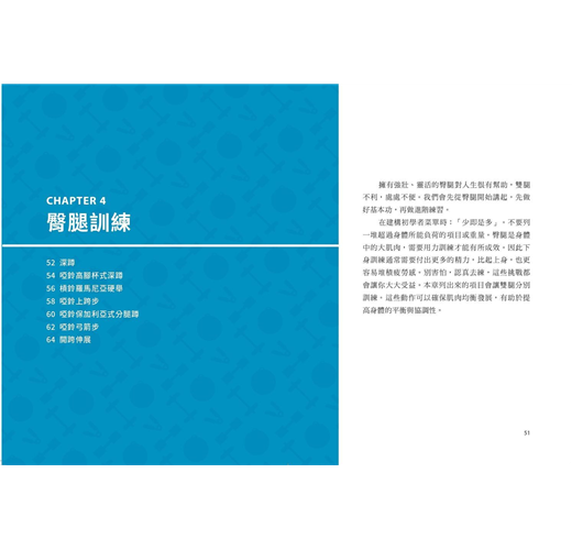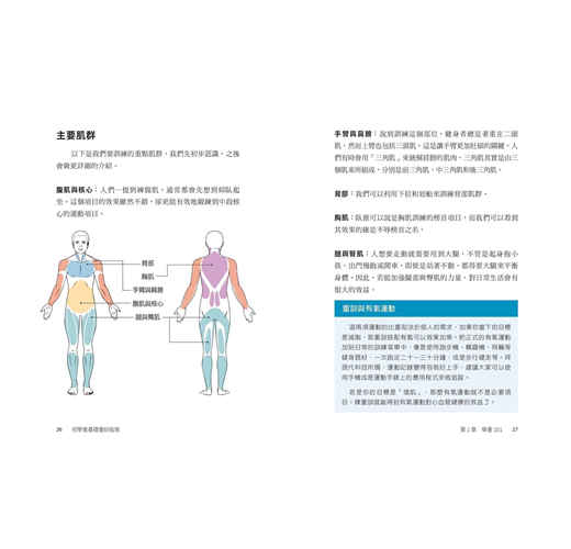 針對背部、手臂、腿部、核心、臀部等5大主要部位肌群,提供全面的訓練動作,不管是居家訓練或機械負重,都能安全又有效的進行鍛鍊。