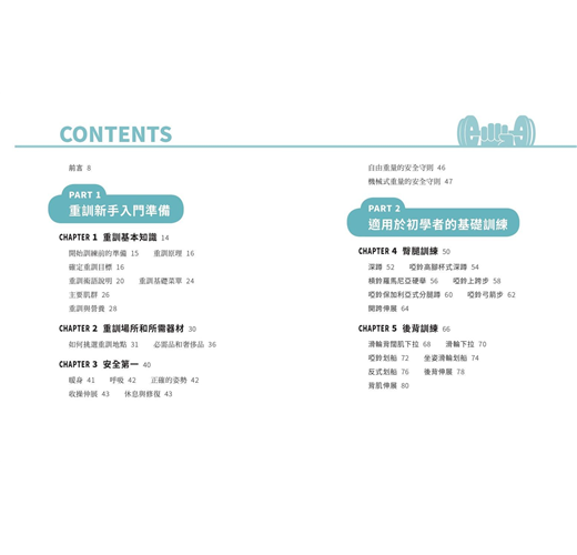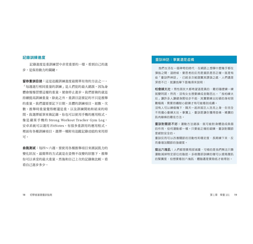 為了確保初學者能夠循序漸進,建立練重訓的正確方式,請從第一章開始著手。若是已經練了有一段時間了,那書裡的一些知識對你應該不陌生。然而,還是希望大家盡量耐著性子再複習一遍,畢竟重新檢視良好的正確習慣,絕對是百益而無一害。