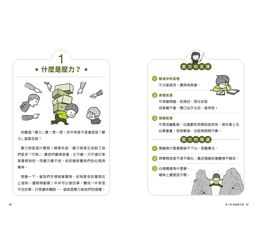 每章開頭以趣味漫畫切入問題,讓孩子融入情境一同思考,抉擇如何應對;每篇的實例練習,以淺顯親切的文字描述,安排井然有序的版面視覺動線,搭配生動插圖映照出孩子的內心戲。