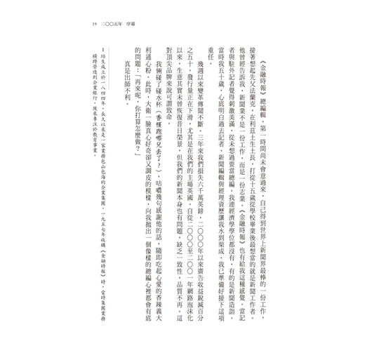 除了有引人入勝的報導和軼事,這本書是他對真正新聞的信念和承諾:尋求事實,而不是置於預設的描述中;平衡和公平是基本,沒有恐懼或偏袒;並善盡報紙解釋和告知的任務。透過接觸領導世界的商業、金融和政治人物,對動盪時代的十五年有非凡的個人與專業洞察力。——東尼.布萊爾(Tony Blair),前英國首相