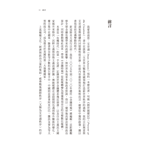 我愛看迪恩.艾奇遜(Dean Acheson)寫的一本歷史書,叫做《創世親歷記》(Present at the Creation),書中在談第二次世界大戰後美國領袖打造新世界秩序的過程。我的日記無意與艾奇遜氣勢磅礡的回憶錄相提並論,但就內容廣度與寫作風格而言,確實從中獲得啟發,據以書寫當前充滿變動的時代。