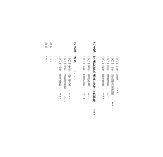 第四部先談法國諷刺漫畫《查理周刊》遭遇恐攻,這是伊斯蘭信徒針對歐洲大城發動數波暴力行動的首波。接著記錄英國脫歐這場大地震前夕種種事件,包括卡麥隆總理任內第三度致命公投豪賭,以及二〇一五年自民黨聯合政府告吹。我會側寫幾位重要角色,像是多明尼克.卡明思(Dominic Cummings)、林頓.克羅斯比(Lynton Crosby)、喬治.奧斯本(George Osborne)及卡麥隆,也會記錄英國脫歐公投帶來的震撼與後果,毀了卡麥隆與奧斯本的政治前途。