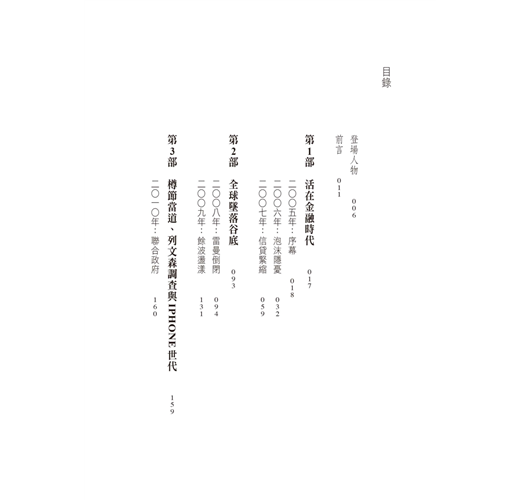 本書分為五部。第一部橫跨二〇〇五年到二〇〇八年,以「威利狼時刻」來形容最為貼切,當時全球經濟正處於信貸泡沫,對即將到來的金融危機渾然未覺。我親眼見證「全盛」時期的倫敦金融圈,當時對沖基金與私募基金稱霸天下,即將輸到脫褲的皇家蘇格蘭銀行更是躋身世界十大銀行之列。然而這場危機其實有跡可循,特別是本報榮獲獎項肯定的金融記者兼評論人吉莉安.泰特(Gillian Tett),就曾點出金融體系過度槓桿的現象。