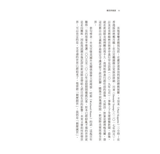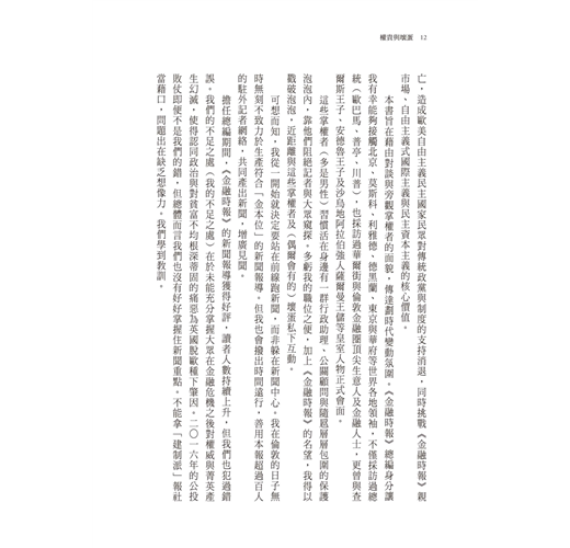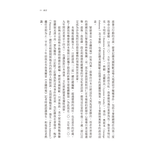 能夠在這段格外動盪時期擔任總編,歷經英國脫歐、川普執政、美中貿易戰與戰後聯盟體制光澤不再,實為難得。日記除了記錄我對這些事件的思索,也記錄我在泰瑞莎.梅伊(Theresa May)擔任首相期間與她在內的政治人物對談,直到最後鮑里斯.強生(Boris Johnson)繼任首相為止。早在三十年前我在布魯塞爾當《金融時報》記者時就認識強生,和他算是老熟識。
