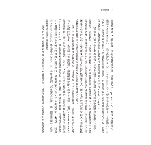 第三部重點放在媒體遭逢數位革命,這場革命不僅加速報紙衰退,也迎來新的碎片化時代。我眼睜睜看著一家英國「傳統媒體」竊聽醜聞發酵,導致魯柏特.梅鐸(Rupert Murdoch)經營的色羶小報《世界新聞報》(News of the World)被迫關門。這起事件也促成列文森調查(Leveson inquiry),旨在檢視新聞業行為與規範,為此我投入將近兩年精神。同時定期造訪矽谷,親眼見證「新媒體」的興起。這背後的一個重要弦外之音,就是維基解密、朱利安.阿桑奇(Julian Assange)與史諾登(Snowden)事件象徵的「資訊流不對稱」與「開源新聞」,給新聞界帶來道德與專業難題。