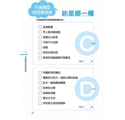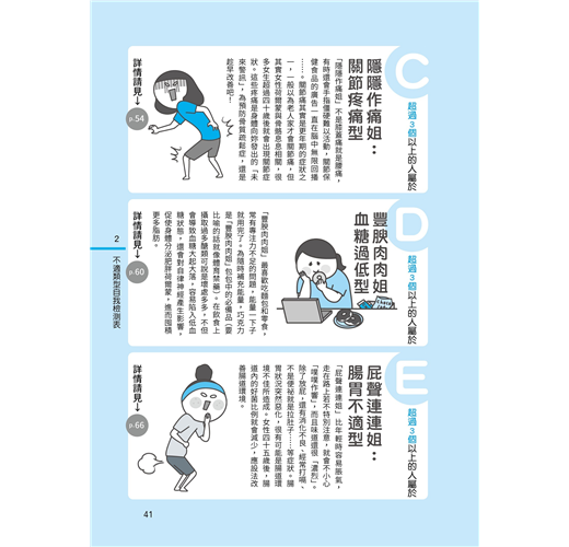 「只是有點不舒服,應該沒差吧?」——妳是不是也像這樣,輕易放過身體的「小病小痛」呢?小心!這些症狀可能是重大疾病的警訊。智春老師告訴大家五種「不適姐」應特別注意哪些血檢項目,如何判讀檢驗數值,以及各種健檢和癌症檢查的內容。想要進行自我健康管理的人,請千萬不要錯過!