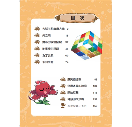 紅針花在森林裡發現了一塊神奇的水晶魔術方塊。在魔術方塊的指引下,他和小夥伴打開光之門,來到了三疊紀的恐龍時代。在三疊紀,植物們結識了埃雷拉龍小王子,得知埃雷拉龍一族全部被腔骨龍用一種神祕的水晶縮小了身體,決定幫助小王子。在鼠龍和艾沃克龍的幫助下,植物們穿越地下迷宮,來到骨頭山,卻發現腔骨龍一族打算處死所有埃雷拉龍……植物們能成功救出埃雷拉龍一族嗎?神秘水晶又是怎麼回事?趕快翻開書,和植物、恐龍一起,揭開水晶魔術方塊的秘密吧!