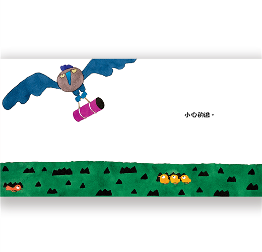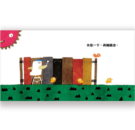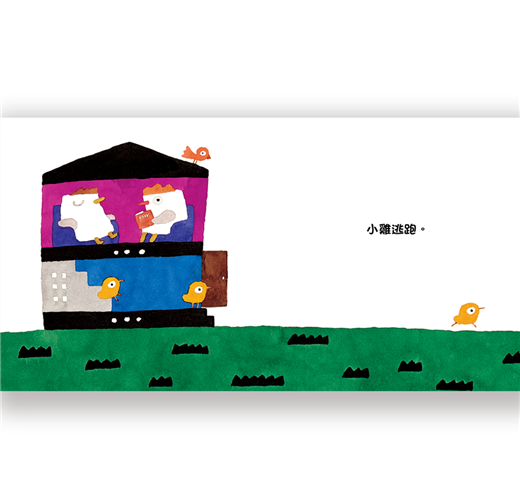 會不會一開始,雞爸媽就只是睜一隻眼,閉一隻眼,在遠端守護著,放手讓小雞們出門玩緊張、刺激的「逃跑」遊戲?這可能只有五味太郎才知道囉。