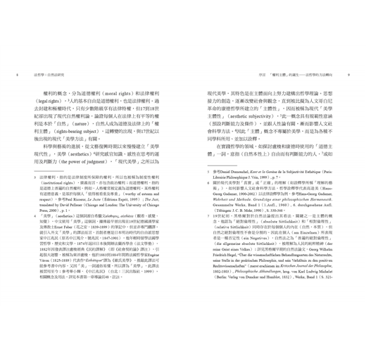 權利的概念,分為道德權利(moral rights)和法律權利(legal rights),人的基本自由是道德權利,也是法律權利。過去封建和極權時代,只有少數階級享有法律特權,但17到18世紀卻出現了現代自然權利論,論證每個人在法律上有平等的權利是本於「自然」(nature),自然人成為道德及法律上的「權利主體」(rights-bearing subject),這轉變的出現,與17世紀以後出現的現代「美學方法」有關。