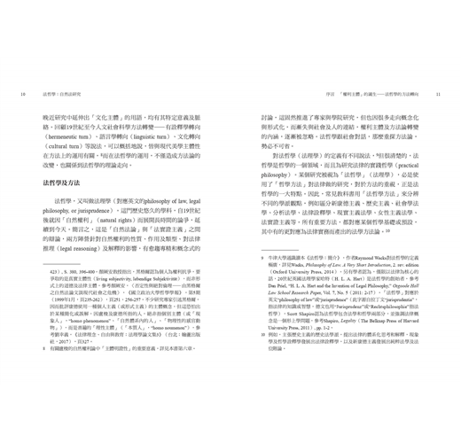 自然法是否存在?這也是最早的哲學問題。古代人善以對話的言談辯證方法,探索形而上的自然法;中世紀的神學家和哲學家善以理性分析方法,論證自然法、神法和人為法之間的關係,而近代受自然科學發展的影響,哲學家融合理性和經驗的推論方法,探索人為的法律與自然法的關係。每個時代提出不同的自然法論,在方法上確實各有擅長,但是在深入研究之後,可以發現自然法論有其發展脈絡,隨著時代所採的方法雖有不同,對自然法的理解也有差異,但卻有一些共通之處,足以讓我們辨識出自然法的本質樣貌。自然法研究能一直吸引著思想家,大概就是因為自然法的真、善與美的價值,即使在最險惡的時局,仍能支撐世人的信念。