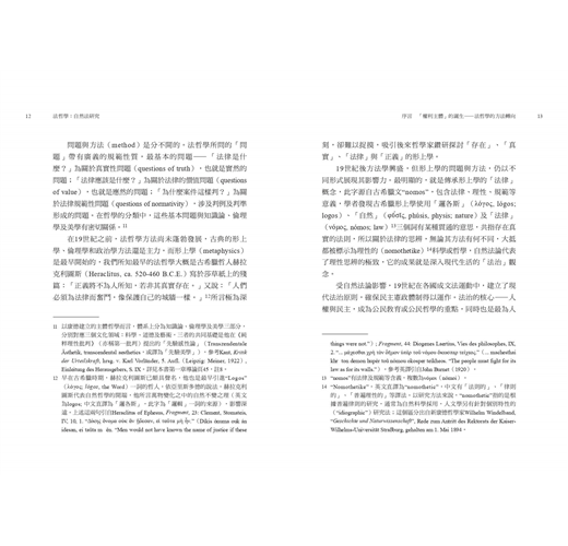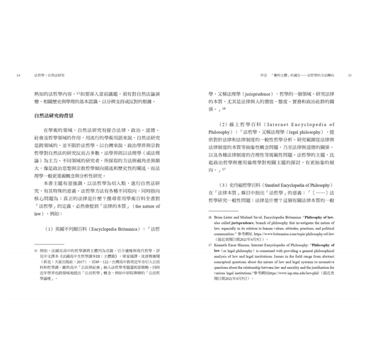 綜觀目前少數系統性著作,幾乎全為外文,或為數人合著,中文讀者透過翻譯和介紹可涉獵諸多觀點,卻較難掌握基本方向。因此筆者不揣譾陋,本書希冀藉由作者個人學習經驗、結合不同語言文獻、研究背景以提供鳥瞰法哲學與自然法關聯的視角,同時為釐清法哲學問題的脈絡、引發讀者自主提問與思考的能力,本書選定以自然法研究為主軸,理由大致有三個:(一)就法律的概念而言,自然法的意義及轉變、它與實證法的關係,始終是認識法律的關鍵;(二)法治、正義與人權均源自自然法論,現代公民教育與法哲學不能缺少這塊知識與立論基礎;(三)就哲學方法而言,自然法研究的廣度與深度不限歐陸法系與英美法系,很適於跨語言的分析和詮釋,自然法研究在方法及議題上的選擇演變,有利讀者發現諸多問題的源頭,從問題導向合適的方法。