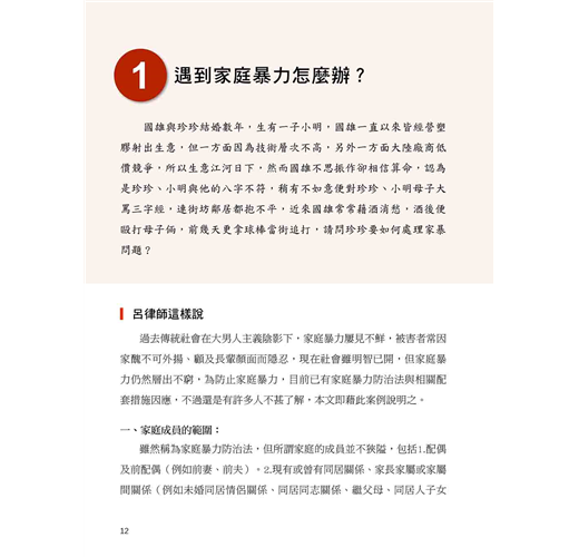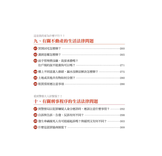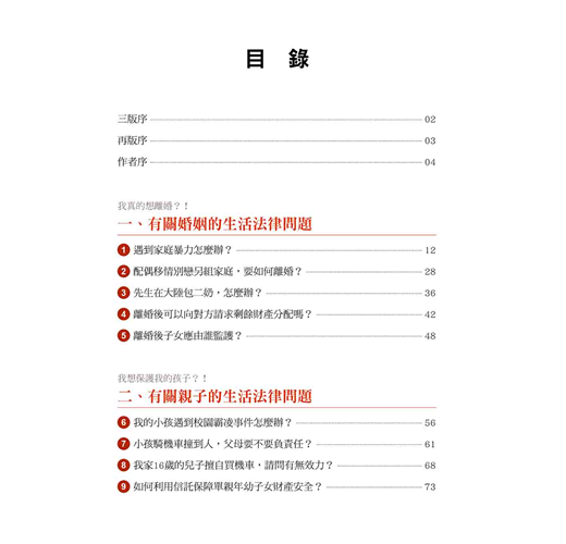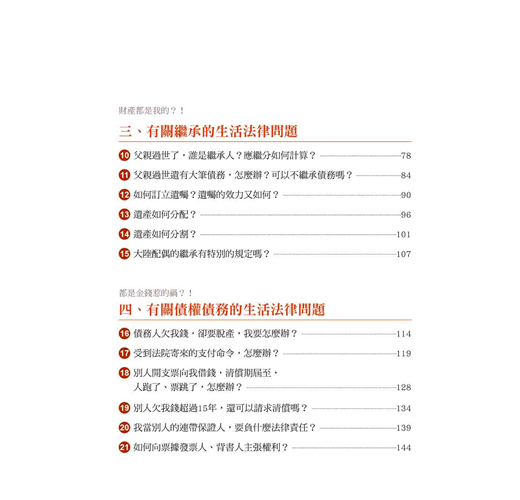 一般人想到法律便聯想到厚重的六法全書而望之卻步,其實大家通常會碰到的法律問題相對於浩瀚如海的法條,簡直只是九牛一毛,也就是說,只要掌握稍許的法律常識就可以應付日常生活所發生的法律問題,所以筆者就依執業多年來的經驗挑選婚姻、親子、繼承、債權債務、職場、消費、網路、交通、不動產、刑事程序等面向來介紹。