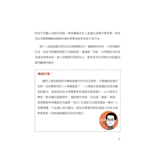 本書擺脫一般人對於法律書籍的冷硬印象,在編排處理上盡量活潑、溫暖化,繪製插圖讓您閱讀起來不枯燥無味,可以將書中所提生活法律內容,完全融會吸收!