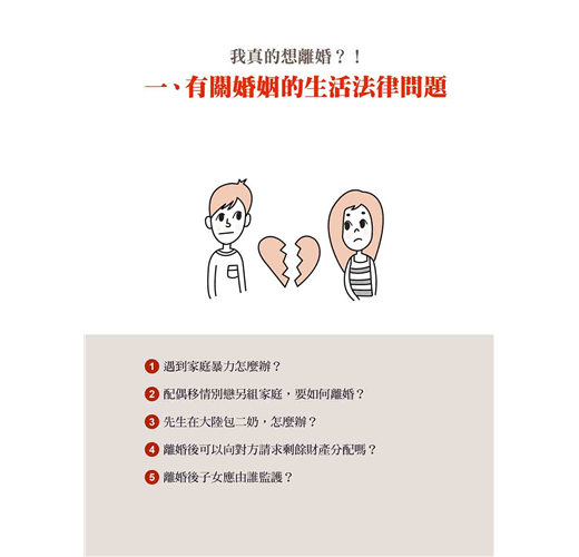 「婚姻、繼承、職場、消費、交通」等生活上遇到法律問題,