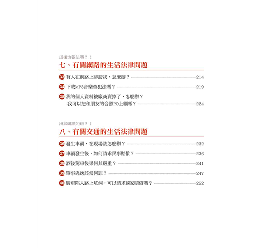 本書為了貼近讀者的日常生活方便閱讀,不以法條說明的方式講解法律問題,而是用實際的案件舉例、口語化的方式說明,讓您可以輕鬆閱讀!
