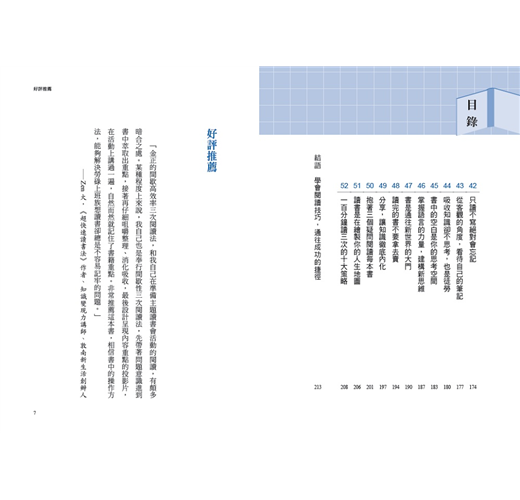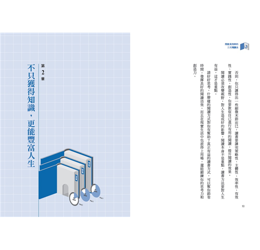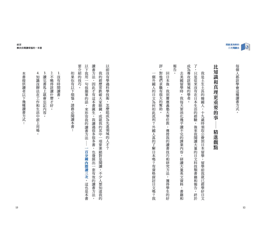 我的經歷常跌破大家眼鏡,成就我的其中一項要素絕對是閱讀。不少人想知道我的讀書方法,因此才有這本書誕生。我讀過很多很多書,也發展出一套有效的讀書方法,以下我用一句很簡單的話,來形容我的讀書方法──一百分鐘內閱讀三次。這也是本書要介紹的技巧。
