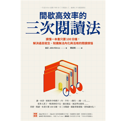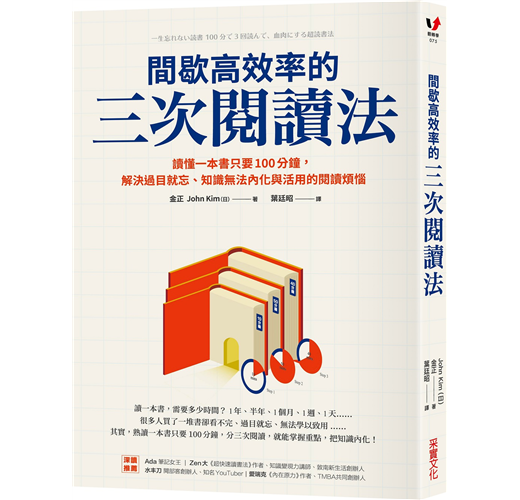 「金正的間歇高效率三次閱讀法,和我自己在準備主題讀書會活動的閱讀,有頗多暗合之處。某種程度上來說,我自己也是奉行間歇性三次閱讀法,先帶著問題意識進到書中萃取出重點,接著再仔細咀嚼整理、消化吸收,最後設計呈現內容重點的投影片,在活動上講過一遍,自然而然就記住了書籍重點。非常推薦這本書,相信書中的操作方法,能夠解決勞碌上班族想讀書卻總是不容易記牢的問題。」──Zen大,《超快速讀書法》作者、知識變現力講師、敦南新生活創辦人