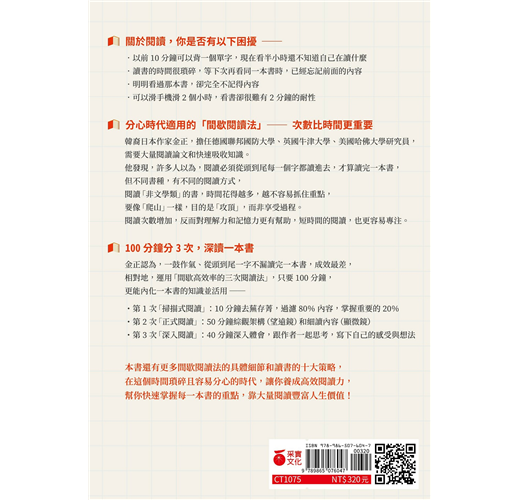 📚 100分鐘分3次,深讀一本書金正認為,一鼓作氣、從頭到尾一字不漏讀完一本書,成效最差,