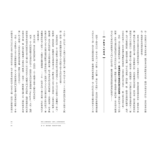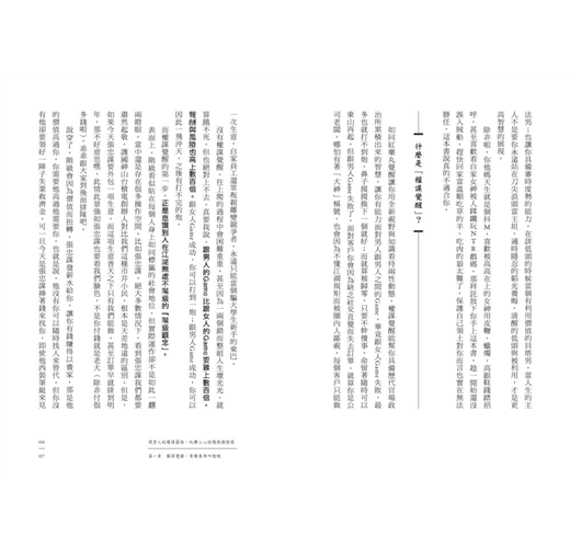 女人可以靠著外貌去獲得男人的資源,甚至成為王的女人化身成貴婦名媛。但男人想獲得資源,進一步提升社會地位,只有想盡辦法創造價值,同時利用知識、手段、社交直覺去獲得權力,以及保護自己的權力。不論你想正面對決,或者使小人步數來陰的(當然我本意是勸人向善,寫這本書是要教大家防身),都需要知識。