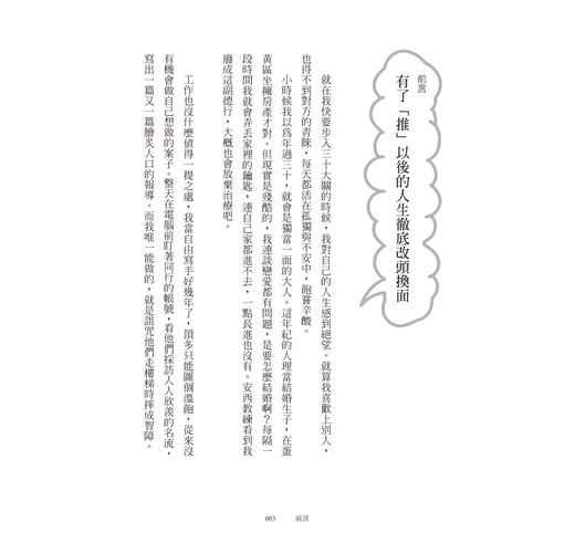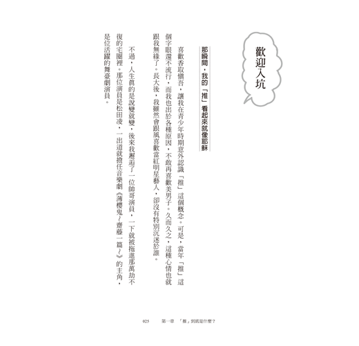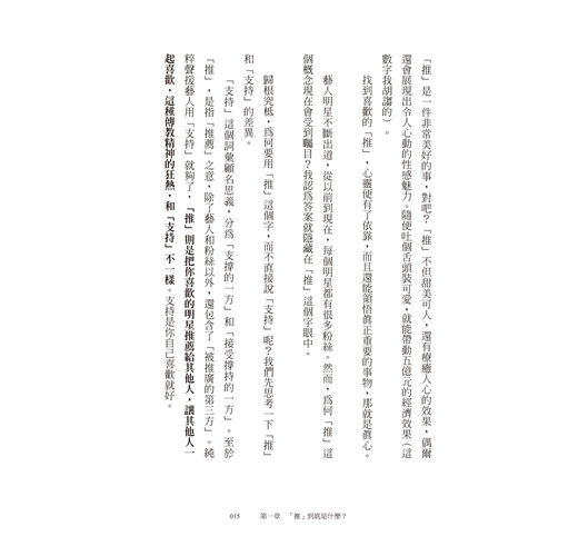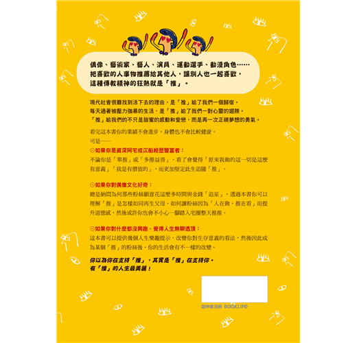 總是納悶為何那些粉絲願意花這麼多時間與金錢「追星」,透過本書你可以理解「推」是怎樣如同再生父母,如何讓粉絲因為「人在做,推在看」而提升道德感,然後或許你也會不小心一腳踏入宅圈整天推推。