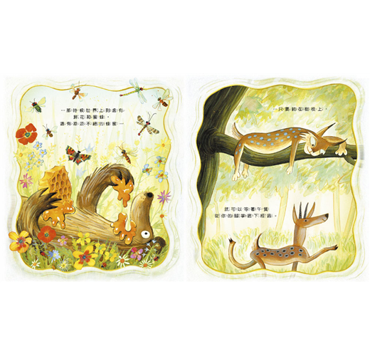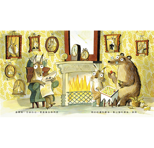 在這個生態寓言中,精彩的圖畫講述了大部分故事。三隻年老動物的樹洞非常古老且溫馨,樹洞壁上展示的祖先肖像畫,隱藏許多詼諧的文學典故,值得大人細細品味。──莎蒙