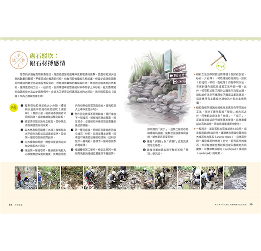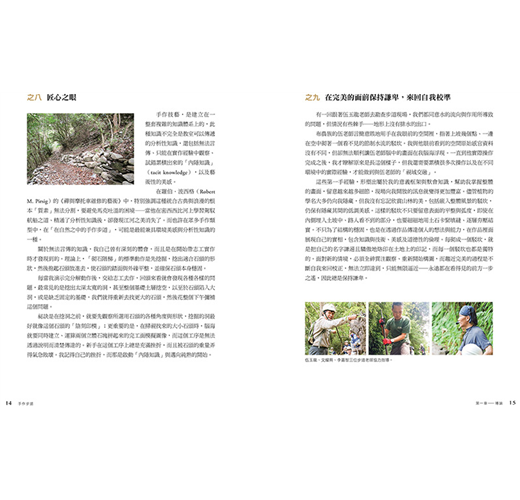 ★人與自然關係的最好註解透過手作步道,人們得以親近自然、徒步走上歷史——細細領略古道上行走的先民生活史、了解地質土壤與植被形成的自然史、觀察大自然的作用力與人的需求,而「就地取材」發展出來的工法智慧、敬重山林萬物的生命觀,更形成了一個正向又永續的循環。