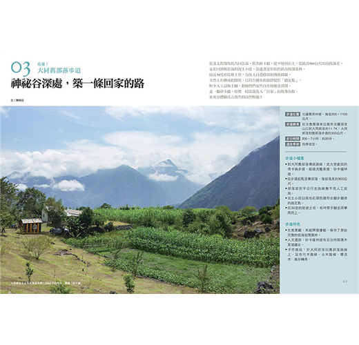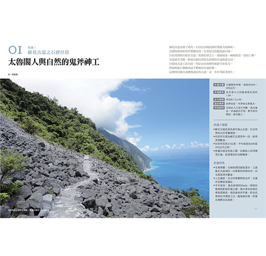 本書從全台灣以手作工法修築的步道之中,精選出13條位於不同區域、海拔環境,並各具獨特性格、工法特色的最美手作步道,透過第一手深度描繪,並以手繪方式圖解步道上的精湛工法,帶你領略天人合一、大隱無形之美: