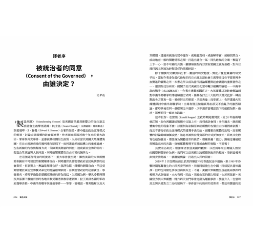這本巨作,在雷根(Ronald Reagan)主政時期尾聲問世,近20年後新增修訂版,如今再翻譯成繁體中文版上市,我們或許會問:多年過去,既然媒體集中化的現象不變、以獲利為依歸而牽制媒體的各個自由市場因素依舊,而且本書分析政治宣傳模式的處理手法如故,而隨著自媒體的出現、反省媒體的討論越臻細膩成熟,消息來源與取得資訊的方式更加多元,民眾文化教育也越加普及,那麼身為閱聽受眾的我們,理應具備「能力」識破這種被框架製造出來的共識、突破媒體報導不足甚或曲解的盲點,不是嗎?